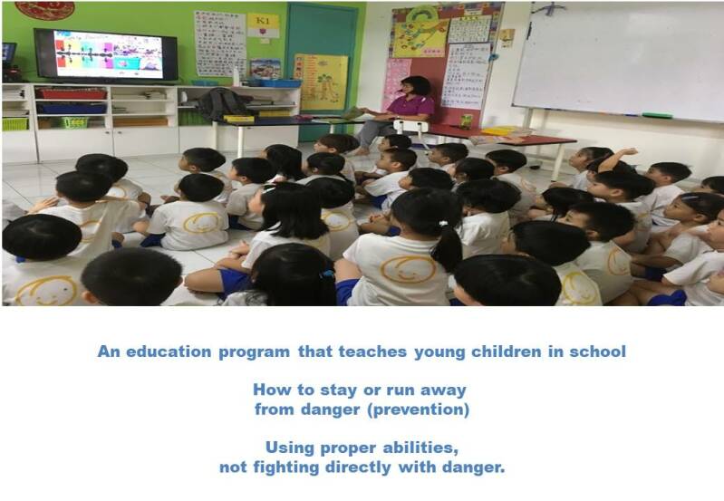 The philosophy of "do not hurt ourselves" and "do not hurt others" ensures children know how to cherish and respect life, as well as safety and at the same time, develop a good and healthy mind and character. This education helps children improve their prevention ability through knowledge, strategy, case sharing, role play and interactive games. Activities include observation, concentration, independent thinking, decision making, safety knowledge, and good personality and behaviour. It lets children understand how to respect each other and help each other in a safe manner. Prevention abilities allows children know how to retreat safely before the danger occurs.