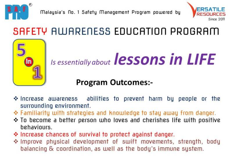 SafPRO 是一套父母和社会所重视的课程。它教导孩子如何维护生命的安全。它是孩子们生命中其中一项重要的基础教育。生命安全通过【安全教育】和 【安全训练】提升孩子对生命安全的意识、知识、行为技能和技巧。确保在危险发生前或者危险发生中可以全身而退和安全离开。让孩子们能够远离危险的主要元素是【预防能力】与【信心】。